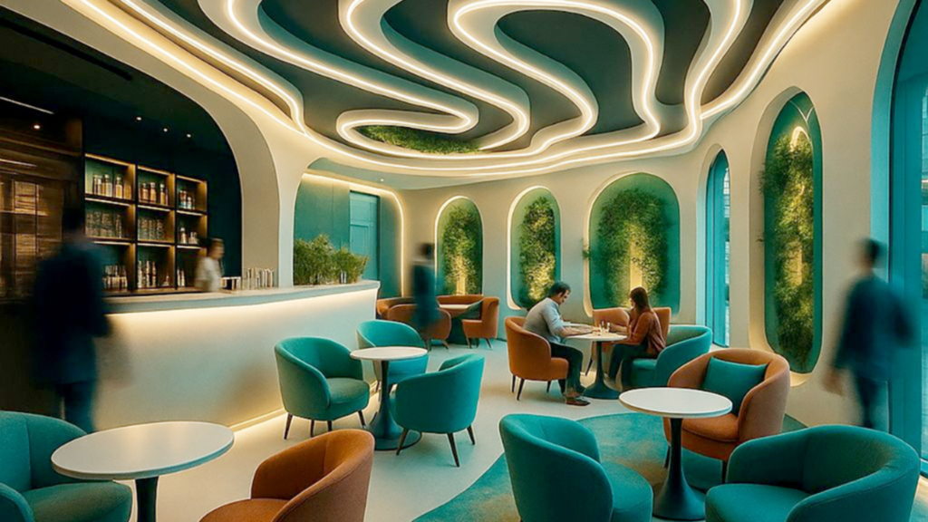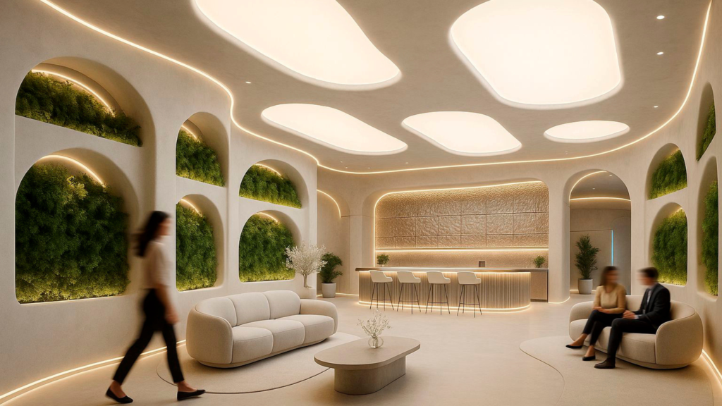 La clave de la arquitectura emocional, un terreno donde Ceilica, mediante el desarrollo de bastidores personalizados, da vida a techos ondulados y volúmenes escultóricos, logrando formas orgánicas complejas que serían inalcanzables con materiales tradicionales.