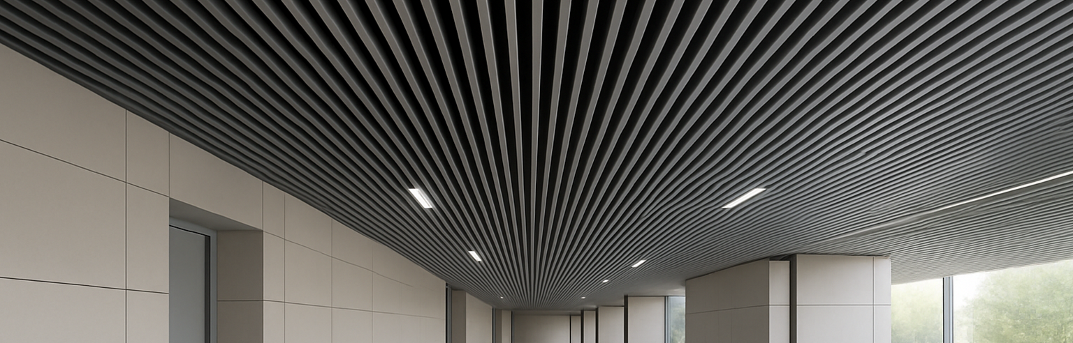 Las lamas pueden ser anchas, estrechas, planas, curvas, microperforadas o lisas, y el aluminio permite acabados prácticamente infinitos: lacados mates, metálicos, anodizados, texturas efecto madera o colores personalizados. Gracias a esta variedad, el sistema se adapta tanto a proyectos sobrios y corporativos como a espacios creativos y contemporáneos que buscan un elemento diferencial en el techo.